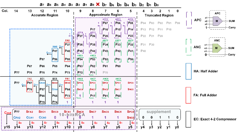 团队设计了两种基于多数逻辑门的近似压缩器,通过在相反方向生成误差以实现误差累积的平衡,并将其应用于8×8近似乘法器中,如图3所示。除此以外,将该乘法器完整映射至2T+1M单元的存储阵列中,采用分区映射策略,在不同阵列之间并行协作,提高计算效率。