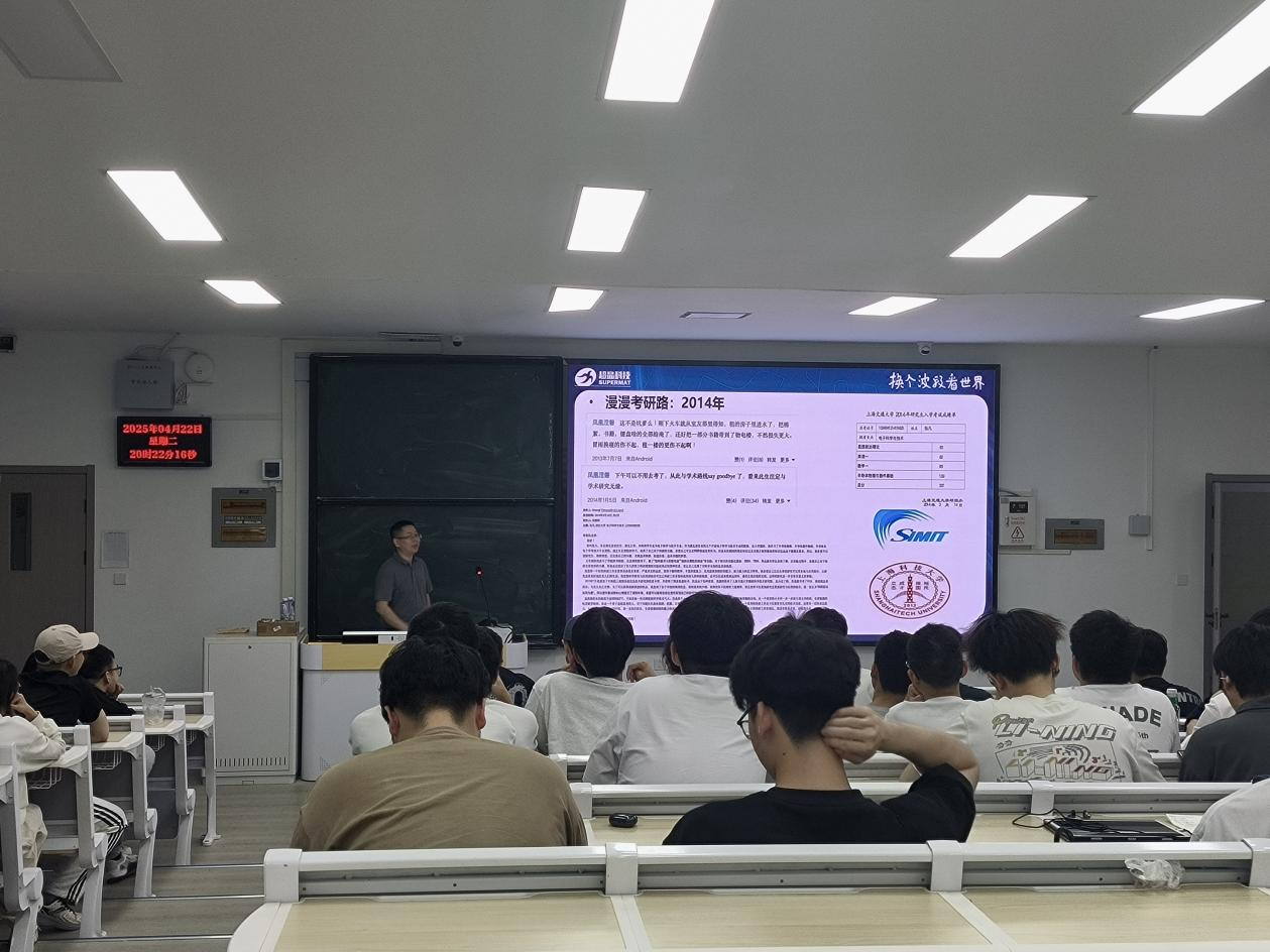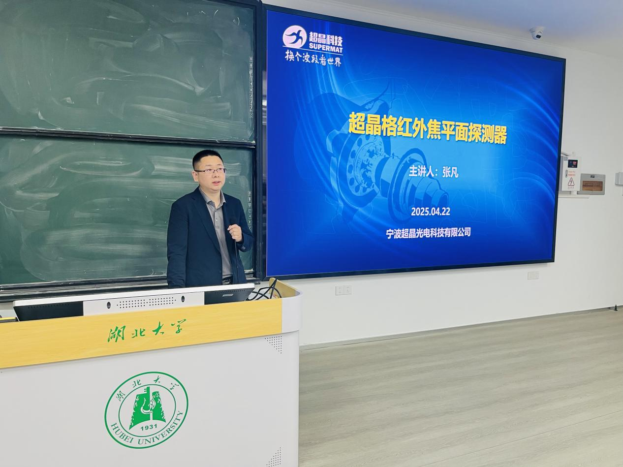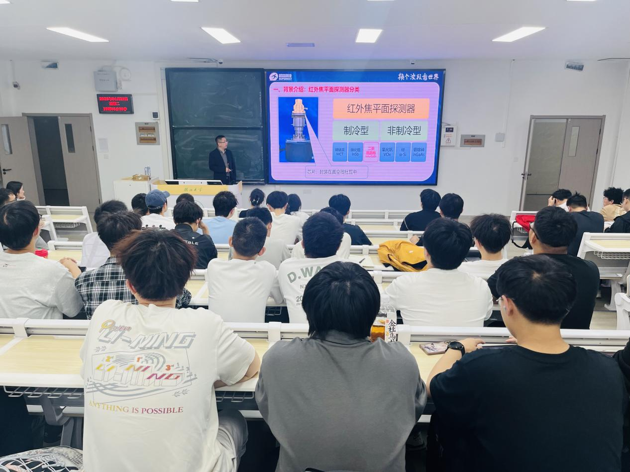 报告伊始,张凡博士立足国家战略需求,系统梳理了超晶格红外焦平面探测器在军事、工业、航空航天以及医疗等关键领域的广泛应用,并详细阐述了当前该领域面临的技术瓶颈。他从半导体器件物理和微电子工艺的角度出发,深入剖析了超晶格红外焦平面探测器的工作原理以及科研产业界的前沿动态,使复杂的理论知识变得通俗易懂,让在场师生受益匪浅。在分享个人经历时,张凡博士介绍了其在宁波超晶光电科技有限公司组建国内首个新型化合物半导体红外焦平面探测器批量生产研发团队的历程。他带领团队成功实现了基于二类超晶格技术的红外焦平面探测器产品的定型和批量生产,为我国在该领域的技术突破做出了重要贡献。张凡博士还强调:“超晶格红外焦平面探测器让我们换个波段看世界,其发展直接关系到国家安全和民生福祉。”他指出,当前光电探测产业链仍存在诸多“卡脖子”技术问题,而行业对电科、光电、微电子和集成电路人才的需求正急剧增加。他鼓励在场员工珍惜在校时光,学好每一门基础课和专业课,并以自身经历为例,阐述了扎实的专业知识在实际工作中所发挥的关键作用:“等你们毕业后从事生产研发工作,就会深刻体会到当年为什么要学习量子力学、固体物理学和半导体物理等课程。”